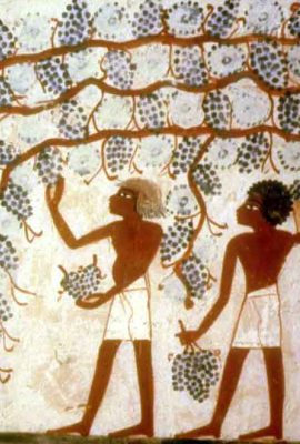 There were also specific jobs with titles like "Master of the Vinyard," and "Master of the Vine-Dresser." The plants were watered by hand generally from a water basin. There were four ways to grow grape vines. One was to erect two wood pillars with the upper ends forked, and a wooden pole laid over the top where the vines were laid. This type of support also forms a hieroglyph which is used in the words meaning 'garden,' 'wine,' and 'vine'. A second way is to train the grape vines to grow on trellis's supported on transverse rafters that rested on columns. Occasionally the columns were carved and painted. A third way was to make vine arbors consisting of branches with the ends placed in the ground to form an arch. And lastly, some vines were grown and pruned to make low bushes and needed no support.The more elaborate vinyards, especially royal ones, could be quite opulent. They would house a variety of sweet fruit trees that line walkways and provided shade; there would be flowers from all over the world and a plethora of lotus and papyrus. They often had terraces and enclosed pools that provided irrigation and had lovely water plants floating freely. You would also find complex and ornate shrubbery, beautiful statuary and decorative columns By the time of King Zoser, whose step pyramid was the first pyramid built, there existed a partial list of vinyards including the famous vinyard "Horus on the Height of Heaven" which produced wine into the Greek period. Egyptians labeled their wine much like we do now, and such a label was found in Saqqara listing the vinyard as the famous Star of Horus on the Height of Heaven in the nothern Xois District. The wine was called Chassut Red (which was said to be good only after fermenting 100 years), Sekem-ka was the vinter, and the wine's quality was classified as twice good (nfr nfr). |