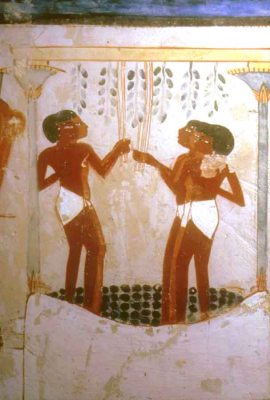 The juice flowed through a hole in the side of the vat into a smaller vat and was poured into pottery jars to ferment. Secondary pressing was done to separate the juice from the stems, seeds and skin, then the juice was put into a sack and stretched, either on a frame with a pole at one end or between two poles, the poles were twisted to extract the juice that was then put into a large container. The wine was fermented in open containers then was racked and put into smaller containers and were sealed with rush bung stoppers and covered with mud capsules; small holes were left in the stoppers that allowed the carbon dioxide that occurred in the secondary fermentation to escape. When fermentation was complete the holes were sealed. At times the wine was strained before drunk, other times it would be siphoned to prevent the dregs from mixing with the wine that was to be poured.The wine vessels were labeled much like wine today with information such as the name of the vinyard, location, year, the vintner and the quality. There were three different grades of quality: good (nfr), twice good (nfr nfr), and three times good (nfr nfr nfr), which was considered the finest. Another way of grading was genuine, sweet, merrymaking (not too good) and blended. It was important to list the vintner’s name so that if the vintner moved to another location his customer’s would know where to find him. At times wine was enhanced by mixing it with other wines or adding herbs and other flavorings. It is possible that honey was added to wine to give it a sweet flavor. Although most people think of wine being synonymous with grapes, the Egyptian’s had five different types of wine: grape, pomegranate, date, fig, palm and other sweet fruits. Palm wine was made by tapping on the trunk of the tree close to it’s branches, the juice was collected and left to ferment. Date wine was made by crushing the dates, collecting the juice and allowed to ferment. A friend of Sementawy Horemheb has this to say about Pomegranate wine, “I have tasted a bottle of pomegranate wine (of recent vintage), and find that it has a fruity, sweet taste no unlike many 'blush' wines made today.” |