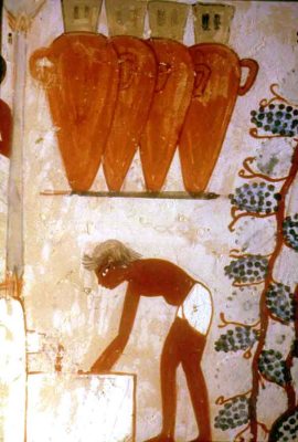 Red wine was very common and it is said that sweet wines have a high alcohol content. Tomb paintings give a look at the ancient wine cellars where amphorae were stacked in rows on shelves, some of the more famous vinyards were “The Phoenix Estate on the Horizon of Kemet in the Sile district, The vinyard Ways of Horus in the Lake Menzalah district, The Preserver of Kemet in the Tanis/Pi-Ramesses district and Estates on the western river. On the canopic branch of the Nile, and highly thought of, this wine was found in cellars in the palace of Amenophis II at Thebes and Armarna. Egypt exported her wine all over the ancient world, including to Rome a country rich in it’s own vinyards. Apparently, Romans most appreciated the wines produced in Lake Menzalah, Tanis, northern Xois and the region of Sile.
